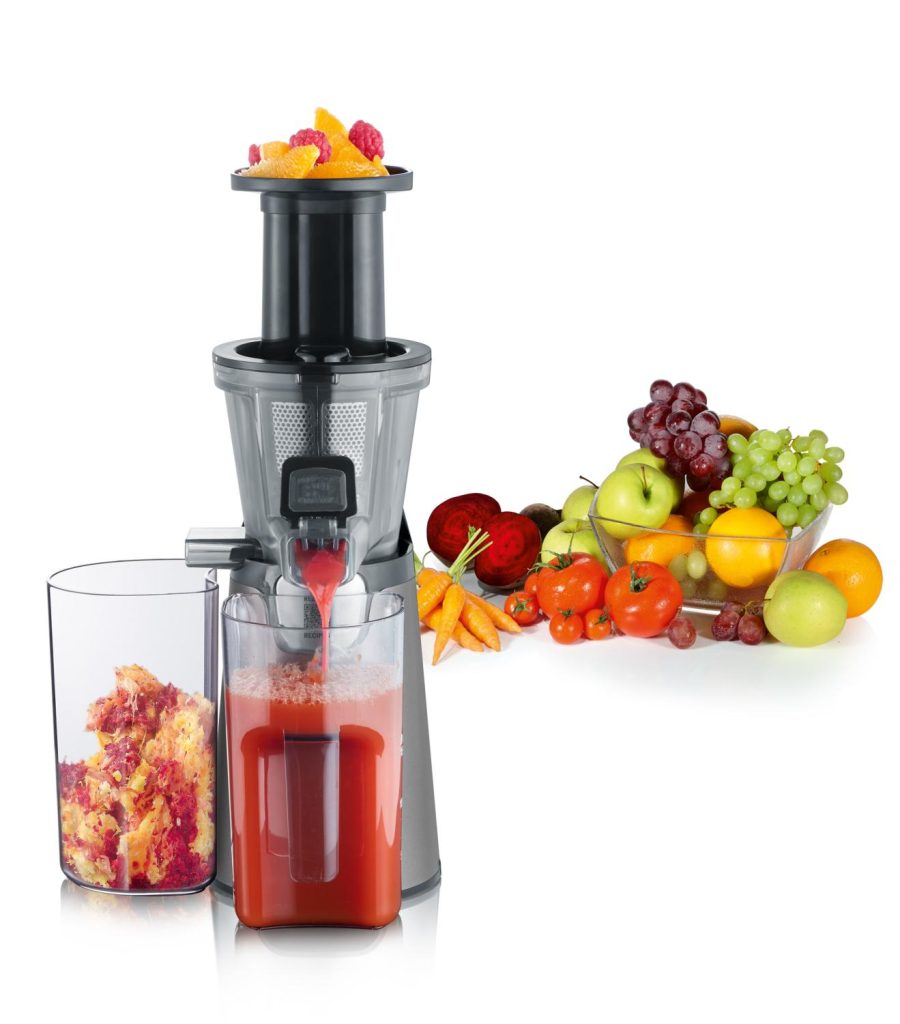 Det extra stora påfyllningsröret på 73 millimeter är en tidsbesparing eftersom du kan mata in stora frukter utan att skära dem först. Maskinen har två hastighetslägen som låter dig optimera juiceutvinningen beroende på om du pressar mjuka bär och tomater eller hårda rotfrukter.